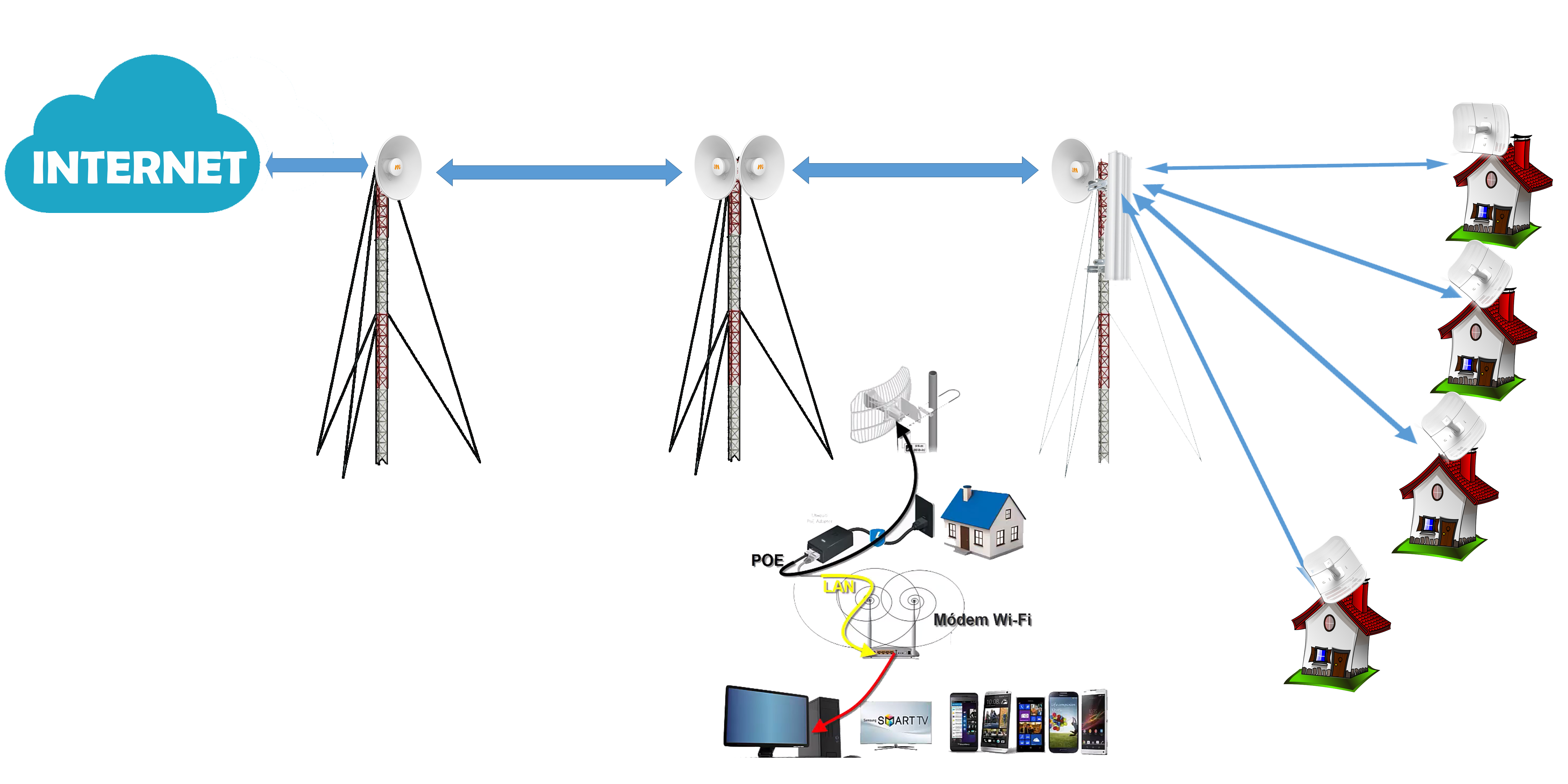 Nuestra infraestructura es por medio de torres, interconectadas por equipos que se conectan por vía microondas, en la última milla esta la torre de la cual se manda el servicio a los clientes por medio de equipos como rocket m5 con sectoriales ubiquiti de 120 grados.
